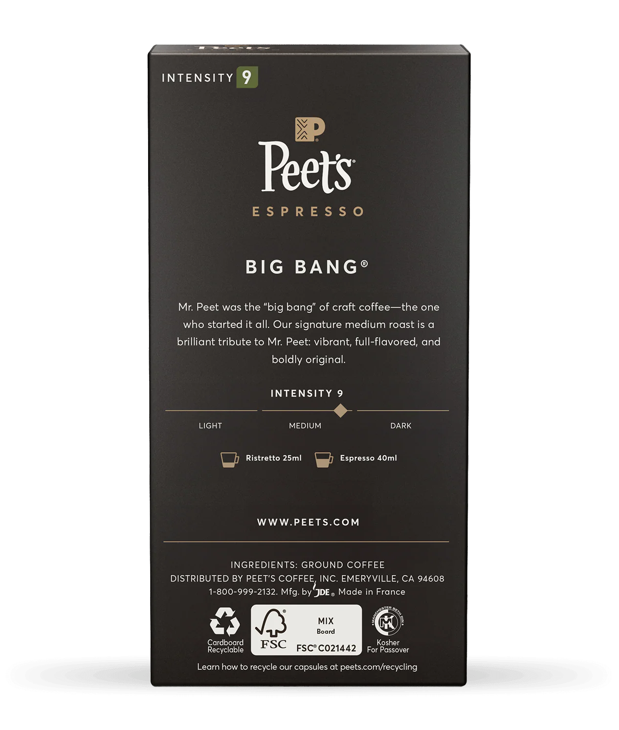 Big BangĀ honors Alfred Peet, the man who upped Americaās coffee game in 1966. Our most-loved medium roastāin espresso capsule formāblends sweet Latin coffees with the citrusy twist of Ethiopian Super Natural. Smooth yet exciting, itās proof that great coffee doesnāt just happen, itās crafted.